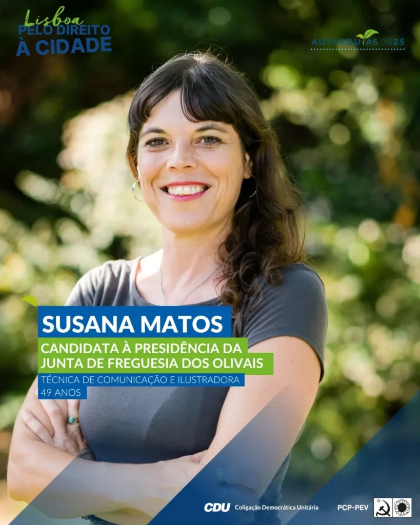 “Faço parte desta lista de candidatos à Junta de Freguesia dos Olivais porque acredito que é com a CDU e com todos os que a nós se juntaram, que é possível conseguirmos mais cultura, melhor educação, espaços verdes mais cuidados, mais actividades desportivas, mais limpeza urbana e parques infantis dignos que as crianças tanto merecem! Porque queremos mais investimento e vontade política de melhorar a vida das pessoas“